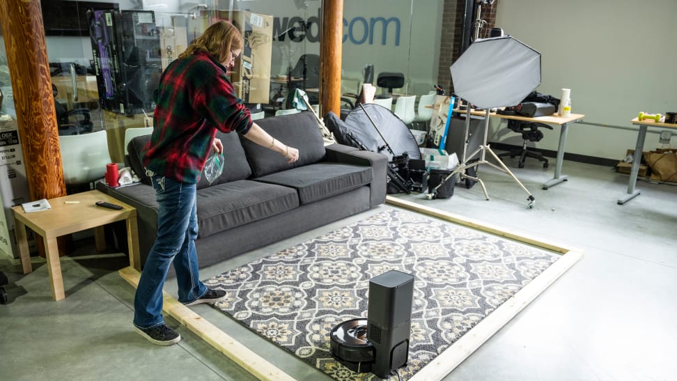 In our lab, we placed an area rug in a 8 ft. x 8 ft. testing zone, and sprinkled 100 pine needles across it (yes, it was extremely tedious to count out 100 pine needles multiple times, thank you for asking). We turned on the the Roomba i7+ robot vacuum, and when it finished its cleaning run, we ran the upright vacuum over the test area to pick up any remaining pine needles.