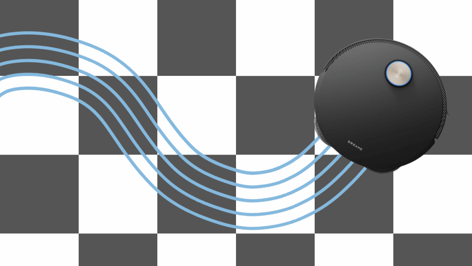 One robot vacuum and mop cleans a black and white checkered floor with graphic water lines