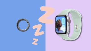 An Oura ring and an Apple Watch sit on a dual-tone background with ZZZs